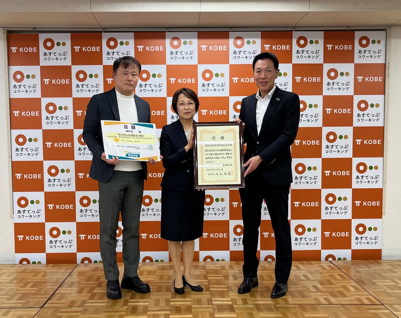 左から 神戸市:地域協働局金井局長 明治安田生命保険相互会社:執行役員近畿地域リレーション本部長 長谷川誓子様 、神戸支社長 石井雅浩様